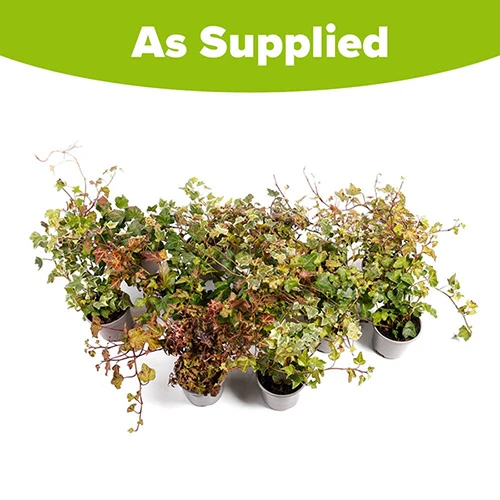 This collection features a duo of ivies, including a solid green variety, and another slow grower with variegated leaves and golden edges.