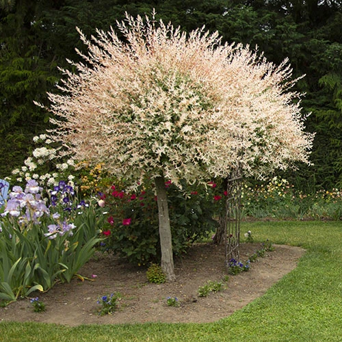The stunning ‘Flamingo Willow’ tree, or Salix integra ‘Hakuro-nishiki’ to give it it’s correct botanical name, produces a stunning spring and summer ritual, bursting forth from bare branches, often with catkins on, into a mass of amazing creamy pink variegated and tipped new shoots, set against white mottled and marbled leaves, keeping that lovely contrast all summer.
