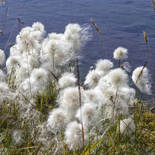 Eriophorum angustifolium (common cotton grass): Marginal perennial (to 5cm deep) with tufts of dark green, linear leaves, with white-hairy flower-heads in summer.